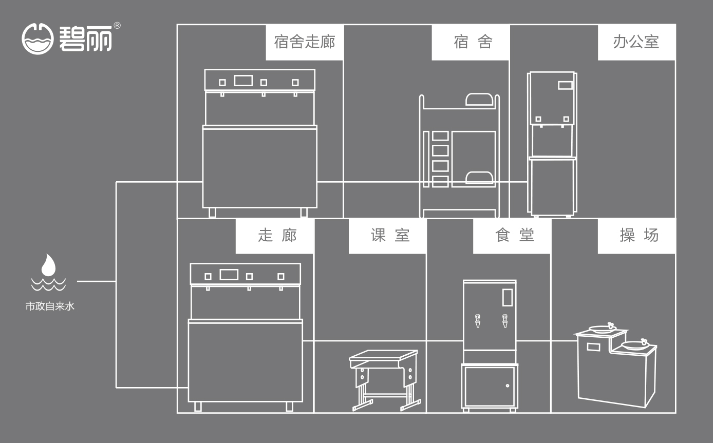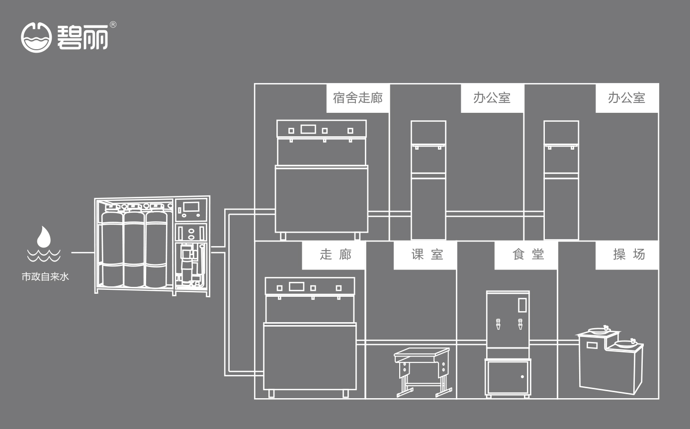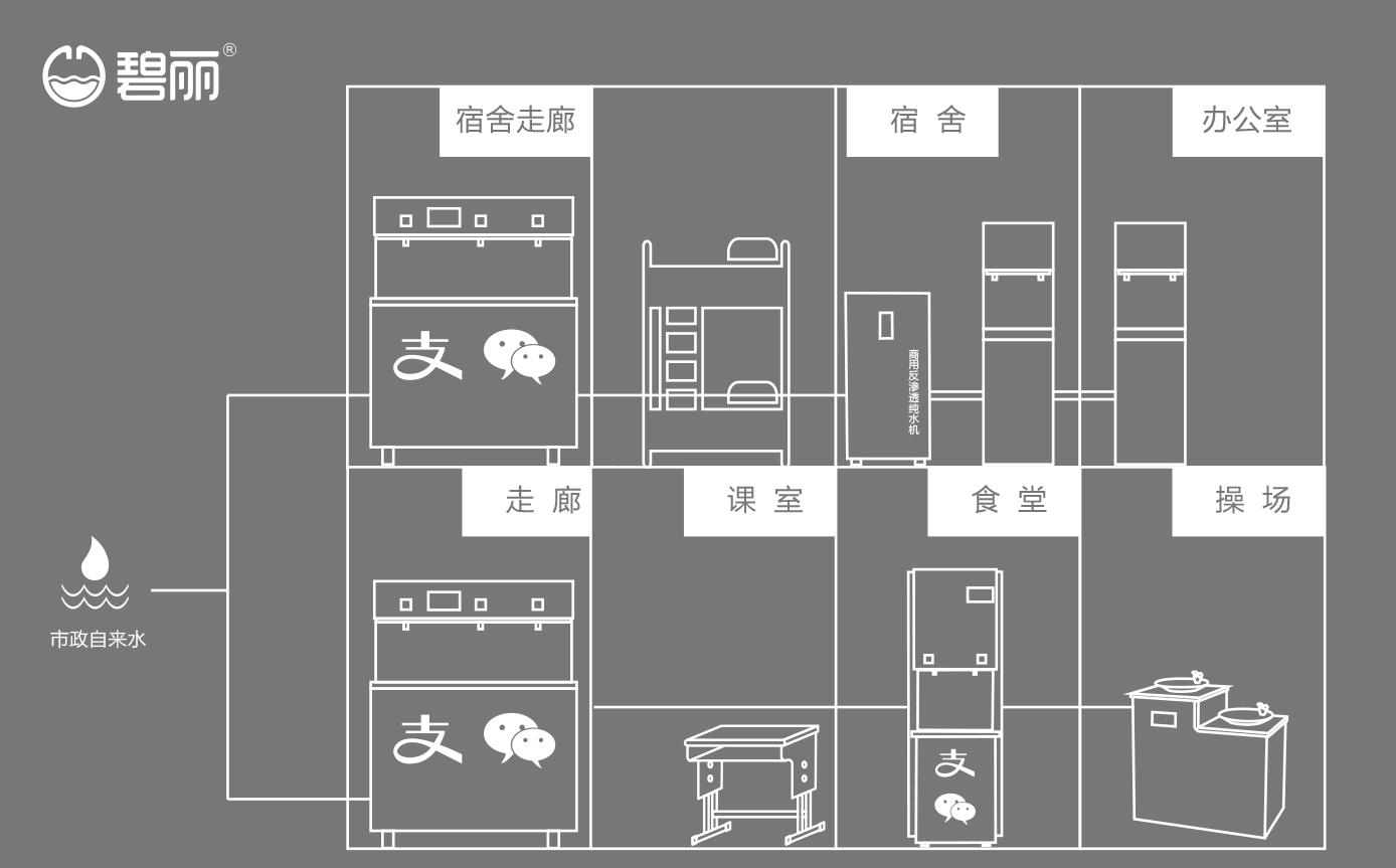 碧麗面向高校不同場景的飲水需求,提供多套整體飲水解決方案