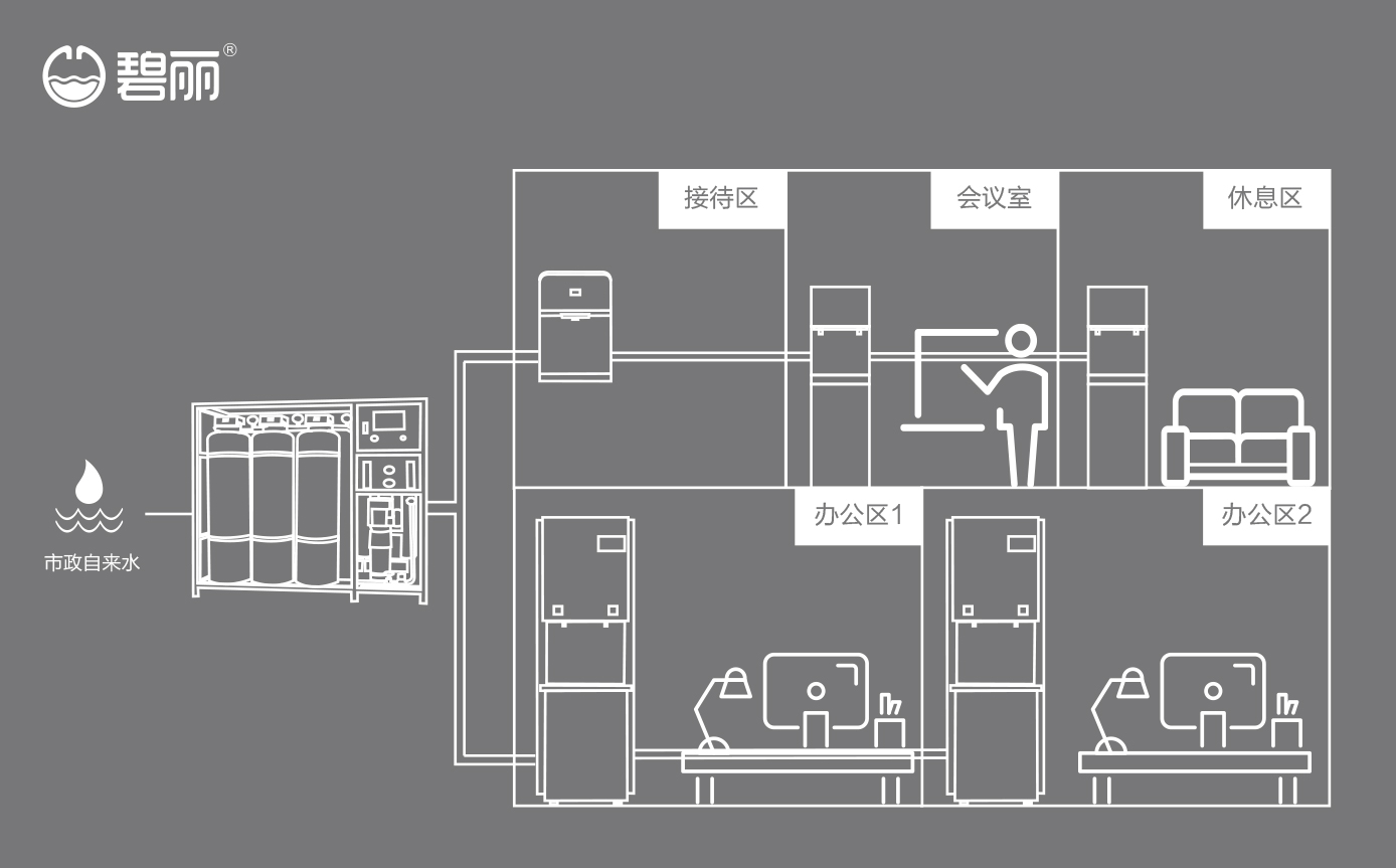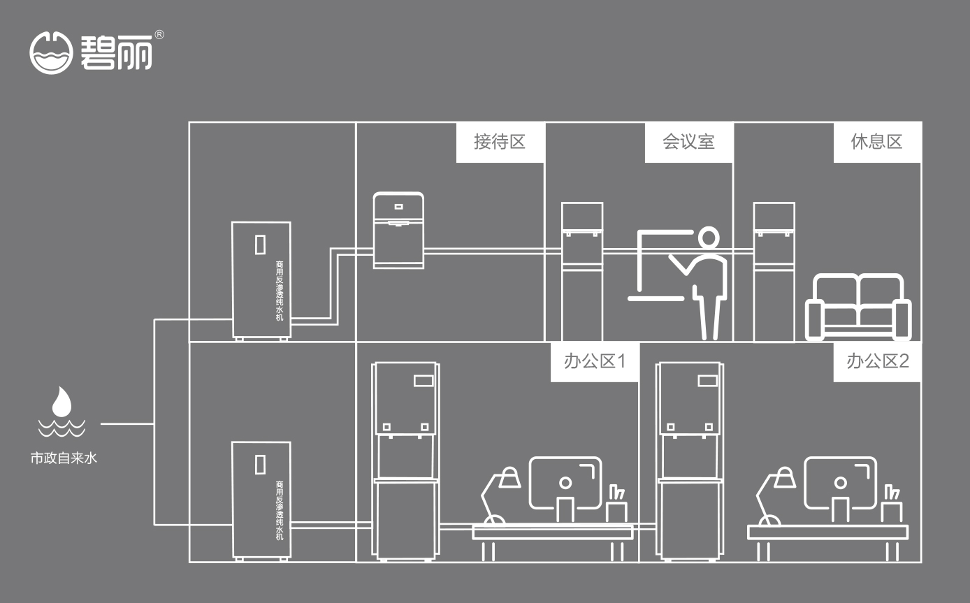 • 碧麗商用反滲透純水機(jī)將自來(lái)水集中處理后,把優(yōu)質(zhì)的純凈水通過(guò)專(zhuān)用的供水管道輸送到各飲水點(diǎn);